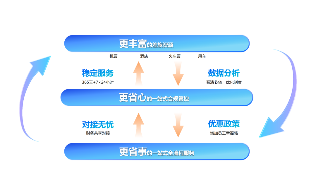 商旅服云平臺提供一站式的解決方案,幫助企業規范管理,提升大家的差旅出行體驗。將差旅制度配置到系統中就能實現差旅標準的差異化管理,實現事前、事中、事后全方位監管。