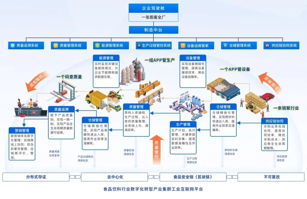 航天云網(wǎng)公司自主開發(fā)的“食品飲料行業(yè)數(shù)字化轉(zhuǎn)型(全域)解決方案”聚焦食品企業(yè)關(guān)注提升生產(chǎn)效率、降低運(yùn)營(yíng)成本、加強(qiáng)質(zhì)量管控等需求,從產(chǎn)品鏈和價(jià)值鏈深度融合的角度出發(fā),提供數(shù)字化轉(zhuǎn)型全域解決方案,涵蓋產(chǎn)品全生命周期管理系統(tǒng)、銷售管理系統(tǒng)、供應(yīng)鏈協(xié)同系統(tǒng)、生產(chǎn)過程管控系統(tǒng)、質(zhì)量管理系統(tǒng)、質(zhì)量溯源系統(tǒng)、設(shè)備運(yùn)維管家、能源優(yōu)化系統(tǒng)、倉(cāng)儲(chǔ)管理系統(tǒng)、成本分析系統(tǒng)等12款應(yīng)用系統(tǒng)產(chǎn)品集。目前,該方案已賦能廣東、貴州、甘肅等多個(gè)省市數(shù)十家企業(yè)實(shí)現(xiàn)數(shù)字化轉(zhuǎn)型,助力制糖、飲用水、食品添加劑、飲料、啤酒等細(xì)分行業(yè)企業(yè)實(shí)現(xiàn)提質(zhì)降本增效。