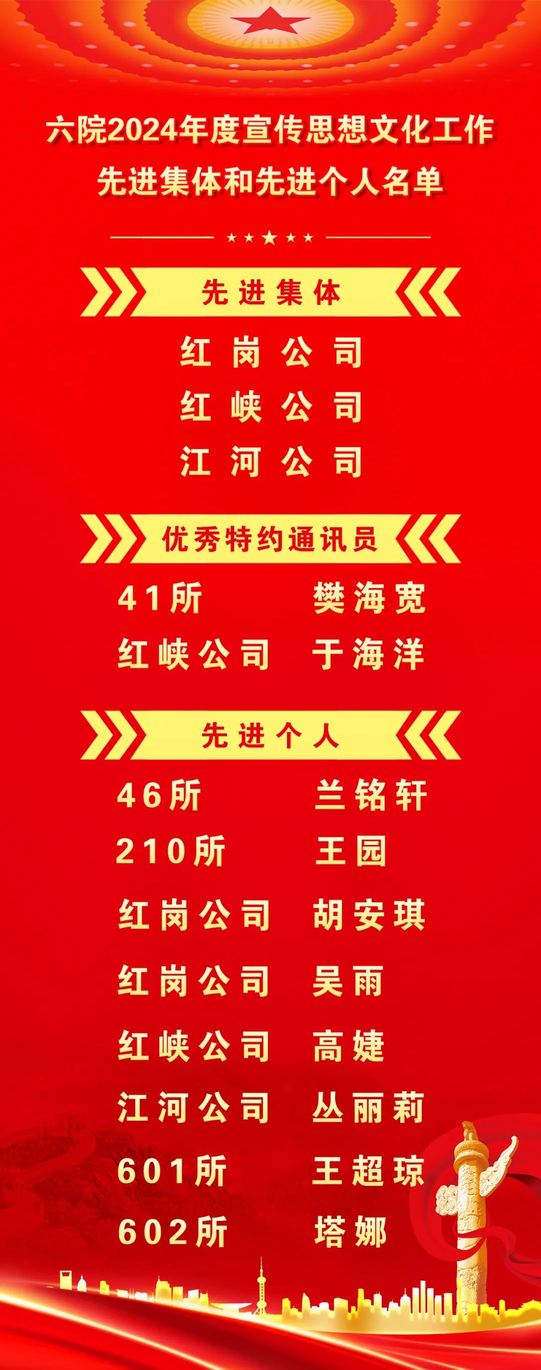 會(huì)上,觀看了六院宣傳思想文化工作會(huì)專題片,通報(bào)了兩年來(lái)全院宣傳思想文化系統(tǒng)獲得的集團(tuán)公司級(jí)及以上榮譽(yù),表彰了六院2024年度宣傳思想文化工作先進(jìn)集體、先進(jìn)個(gè)人。先進(jìn)集體和先進(jìn)個(gè)人代表作了現(xiàn)場(chǎng)交流。