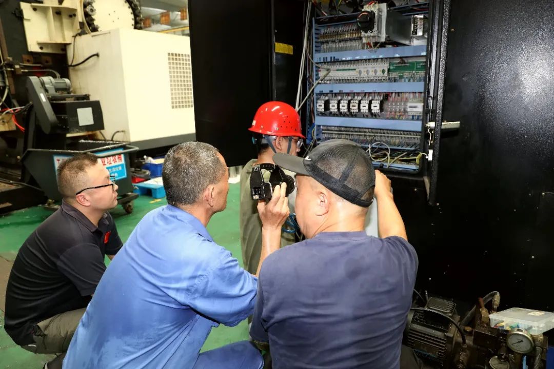 7月9日,氣象臺發(fā)布高溫橙色預(yù)警。炎熱夏季,正是設(shè)備問題高發(fā)之時,險峰公司機動保障部全力保障設(shè)備正常運行,機修工老張和小蘇正與設(shè)備廠家人員共同協(xié)作維修著故障設(shè)備。(圖文/張玉蓮)