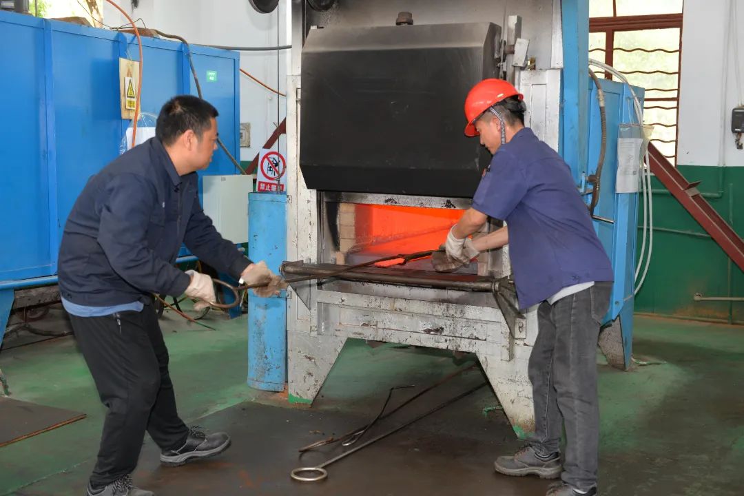近期,生產(chǎn)任務(wù)繁忙,紅林公司的熱處理車間開啟“燒烤”模式。正火、退火、回火、淬火……工人師傅們嚴(yán)格按照工藝要求進行熱處理,確保產(chǎn)品性能符合要求。圖為熱處理班組師傅正在檢修加熱爐。(圖文/張旺)