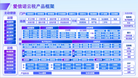 愛信諾云稅秉持“讓財稅管理更簡單、更智能、更有價值”,提出業務流程一體化、數據資產一體化、風險管控一體化、業財稅融合一體化“四個一體化”理念。產品采用“三端一平臺”架構,即SaaS云端、移動端、運營管理端、連接服務平臺,覆蓋銷項管理、進項管理、電子憑證管理、費控報銷、電子檔案管理、全稅申報、合規風控等核心模塊,構建“開、收、用、管、報”全鏈路閉環。