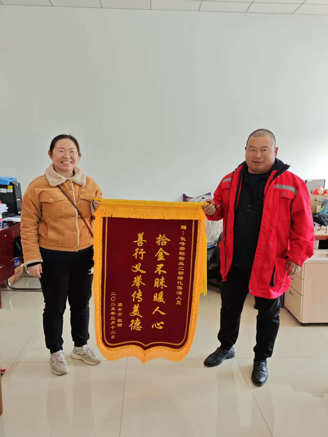 近日,藺女士將一面印有“拾金不昧暖人心,善行義舉傳美德”的錦旗送到了航天二院長峰新聯公司物業二部辦公室。這面錦旗背后竟然有一個讓人感動的溫暖故事。