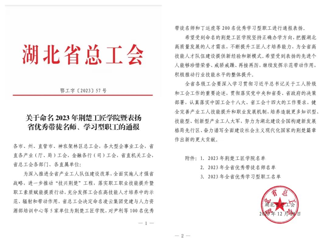 同時,從湖北省總工會《關于命名2023年荊楚工匠學院暨表揚省級優秀帶徒名師、學習型職工的通報》(鄂工字[2023]57號文)獲悉,公司職工呂品喜獲2023年湖北省“優秀學習型職工”榮譽稱號。
