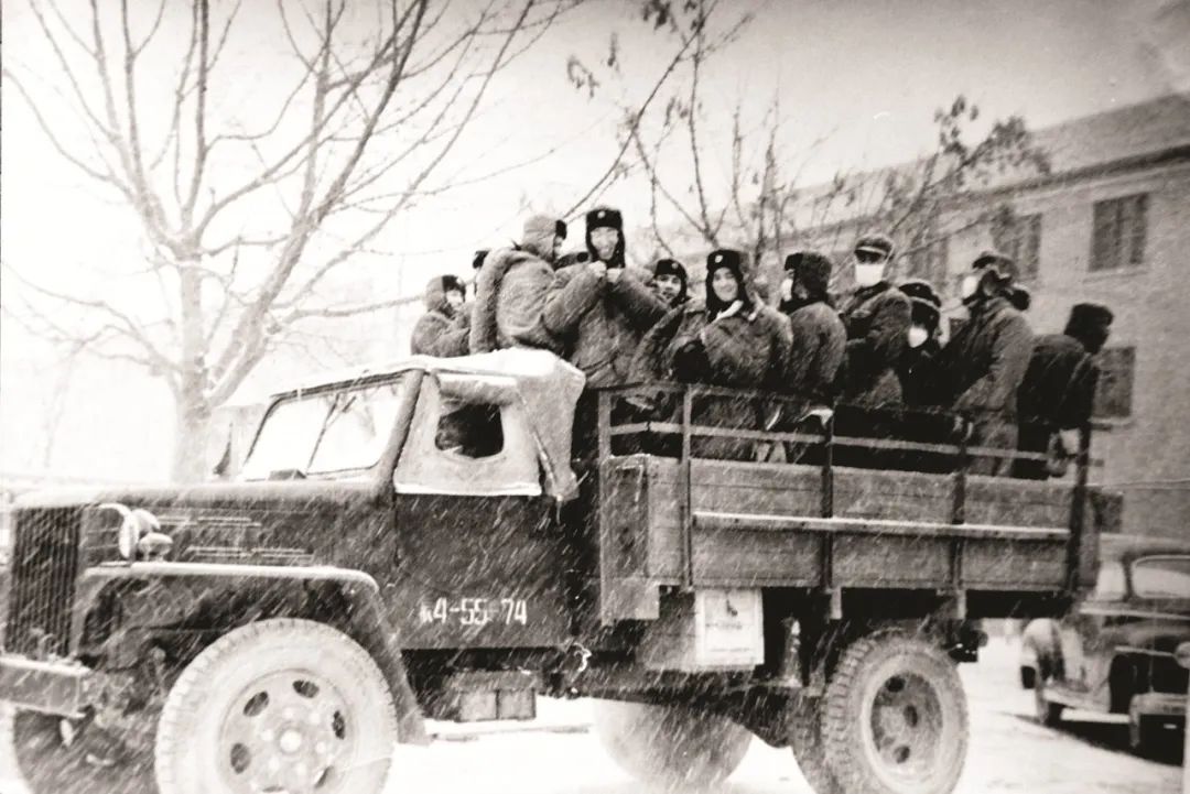 1959年張履謙前排(左一)等人在風(fēng)雪時(shí)節(jié)奔赴紅旗一號(hào)導(dǎo)彈雷達(dá)試驗(yàn)場(chǎng)的途中